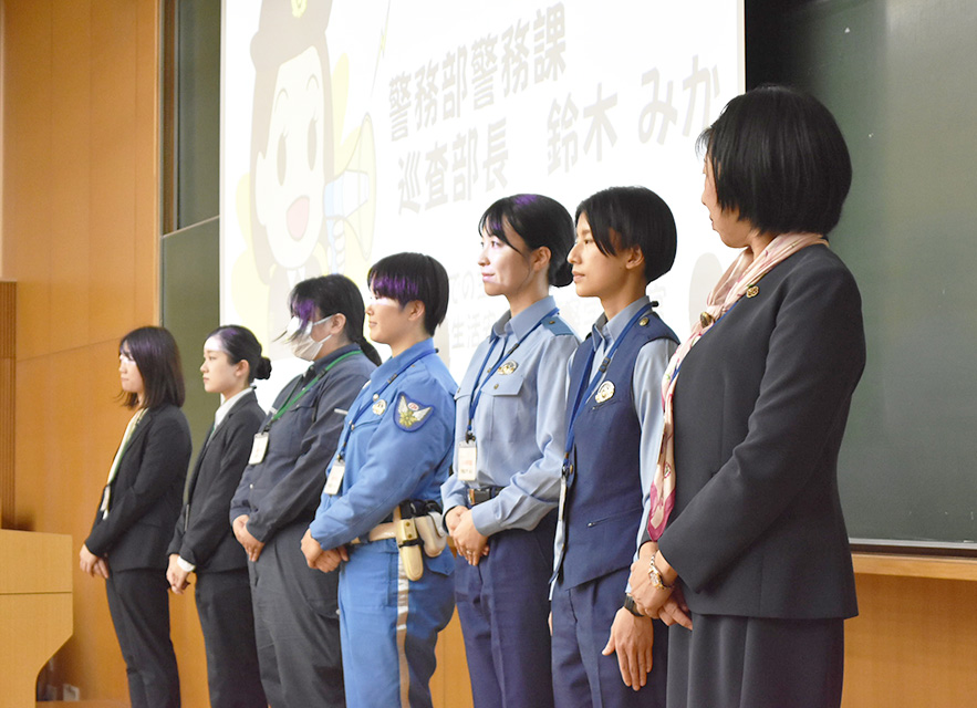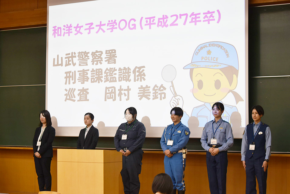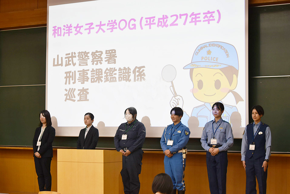 高速道路交通警察隊隊長として活躍する方を始め、鑑識や捜査に携わる和洋女子大学のOG(卒業生)、音楽隊隊員、カラーガード、白バイ隊員など、警察の多彩な職種で活躍する女性たちが登壇。警察事務を含む幅広い業務の紹介に加え、公務員としてのキャリア形成についても貴重なお話をいただくことができました。学生たちにとって警察の職種の多彩さやキャリアについて知る良い機会になりました。