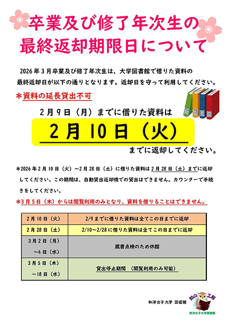 2026年3月卒業・修了年次生の方は、資料の返却期限にご注意ください。2月9日(月)までに借りた資料は、2月10日(火)までに返却してください。延長貸出はできませんので、必ず返却期限日を守って利用してください。