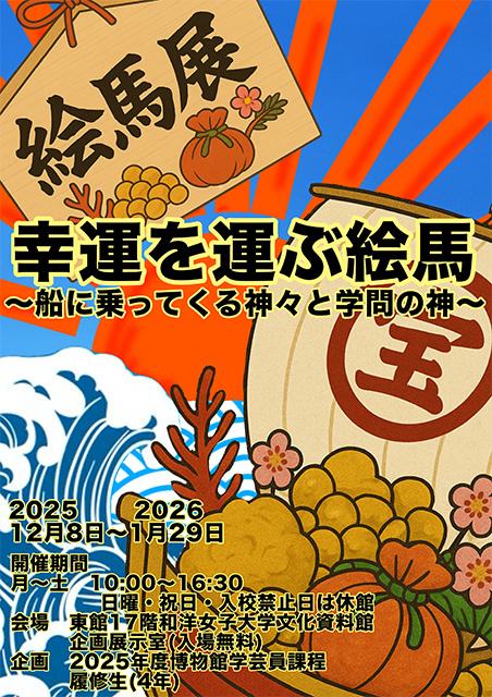 本展示は、本学博物館学芸員課程を履修する4年生が年度当初から調査・企画をすすめ、展示設営にあたりました。今年度は2チームに分かれ、昭和期に収集された絵馬を展示・紹介します。学習の成果を是非ご覧ください。