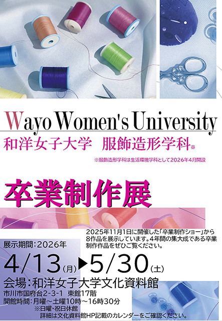 4月13日(月)~5月30日(土)までの期間、2025年度 服飾造形学科「卒業制作作品展」を、和洋女子大学 文化資料館(東館17階)にて開催しています。
