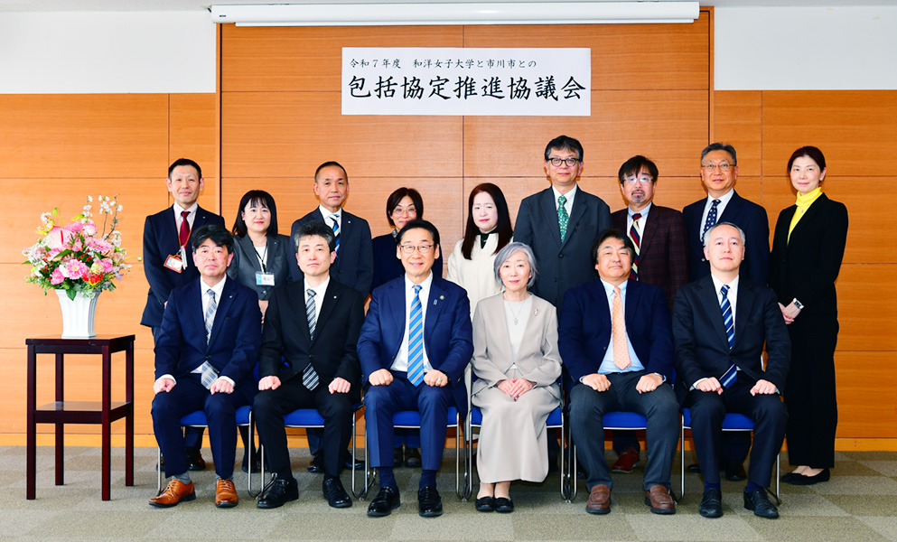 2026年3月17日、和洋女子大学は市川市と連携、地域貢献と双方の発展を目的とした「包括協定推進協議会」を本学の東館16階会議室にて開催しました。本協議会では、出席者による挨拶に続き、運営要項の改正について協議を行うとともに、令和4年度から令和7年度までの連携事業の報告が行われ、その後、活発な意見交換が行われました。
