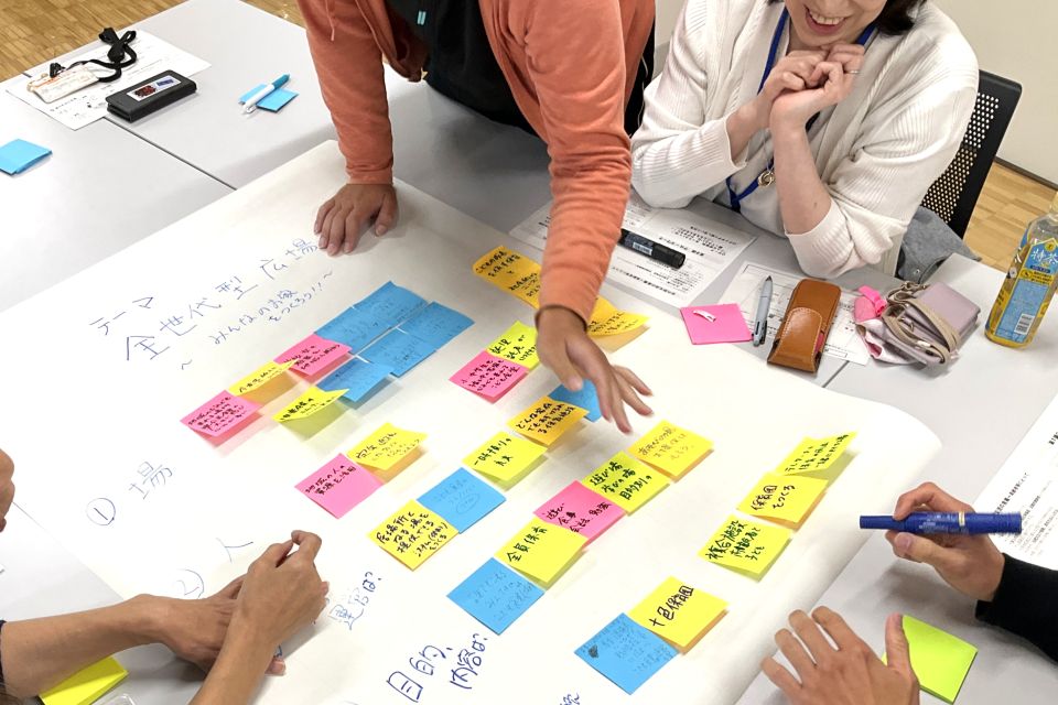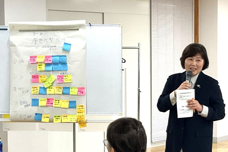 後半は、前半の講義での学びを踏まえたワークショップが行われました。「こんな居場所、あったらいいね~ 創ってみたいね、わがまちに!」をテーマに、受講生が2つのグループに分かれてアイデアを出し合いながら話し合い、それぞれが考案した新しい居場所を発表しました。先生が講義でお話されていた「こどもをまんなかに」を軸に、「全世代型広場」や「校内カフェ」「公的スペースの活用」等の楽しいアイデアが出されました。