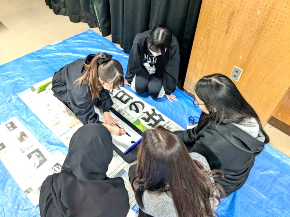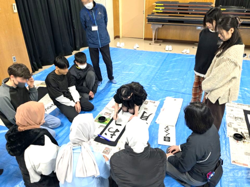 今回、何よりもうれしかったのは、「書道といえば和洋女子大学」ということでご依頼をいただいた、ということです。そのことがうれしく、今回、参加の学生たちも自然と気合いが入りました。外国籍の方たちが多いと聞き、少し不安がありましたが、心配はいりませんでした。皆さん、勤勉で日本語力もなかなかのものでした。たとえ言葉が通じなくても、身振り手振りでどうにかなるものです。みんな笑顔で前向きに楽しんでもらえたようです。書き初めは集中力、体力ともにかなり消耗します。それでも力作を書き上げた生徒たちの顔は充実していました。指導をした学生たちも、「書道」の素晴らしさと、教えることの素晴らしさをあらためて実感しました。すばらしい機会をいただきました大洲中学校の皆さん、本当にありがとうございました!