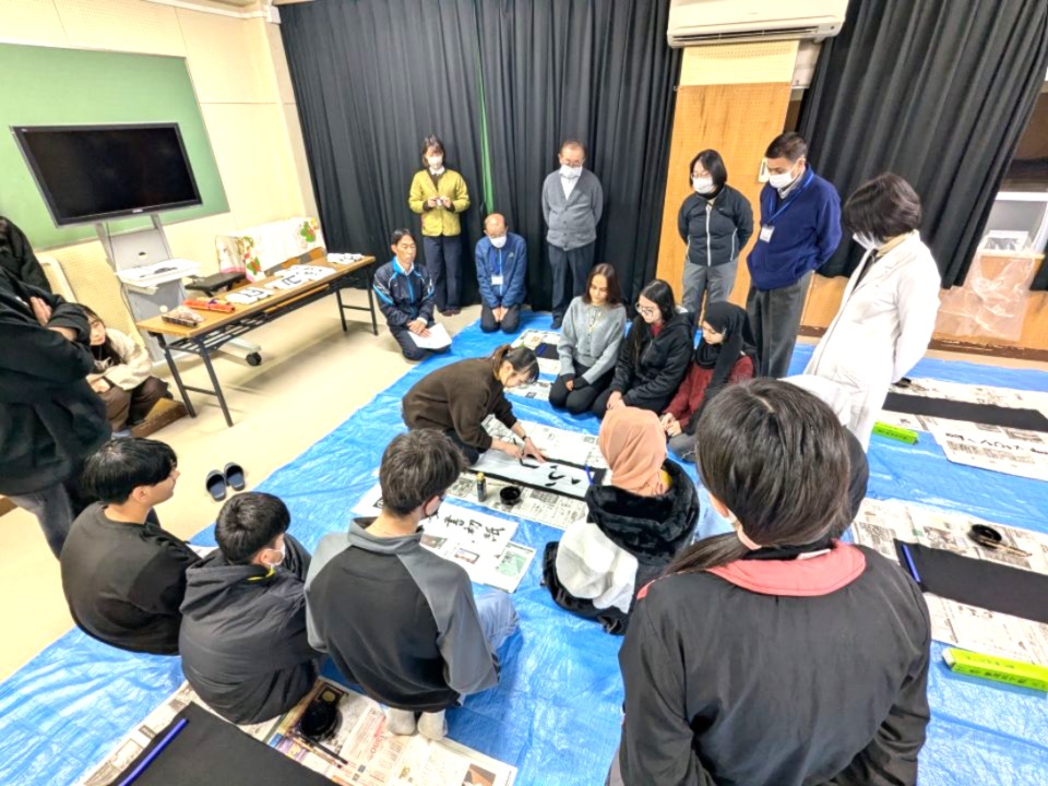 参加した生徒たちは、初めて筆を手にする方が多いため、書道専攻の学生たちは筆の持ち方や半紙の置き方など、基礎から一人ひとりに丁寧に説明しました。学生がお手本を書いて見せる場面もあり、「ふじ山」「お正月」「初日の出」などの言葉を半紙に書きました。説明に熱心に耳を傾ける生徒の姿が印象的で、お互いに世代も近いことから、終始和やかで活気のある雰囲気の中で書道を楽しみました。