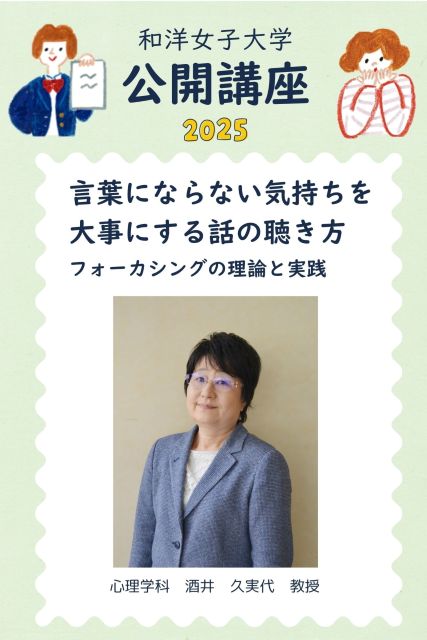 10月11日、産官学・地域・生涯教育センター※主催の公開講座「言葉にならない気持ちを大事にする話の聴き方 フォーカシングの理論と実践」を開催しました。講師は、心理学科の酒井久実代教授です。