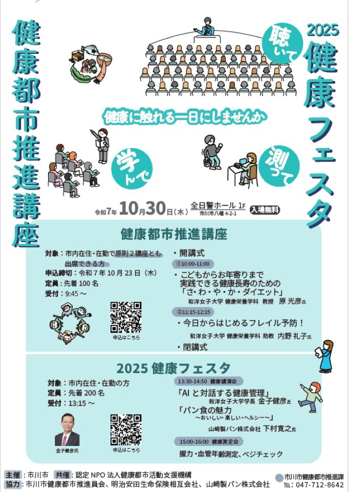 今年度は、10月30日(木)に「健康都市推進講座」と「2025健康フェスタ」を全日警ホール(市川市八幡4-2-1)にて同日開催します。