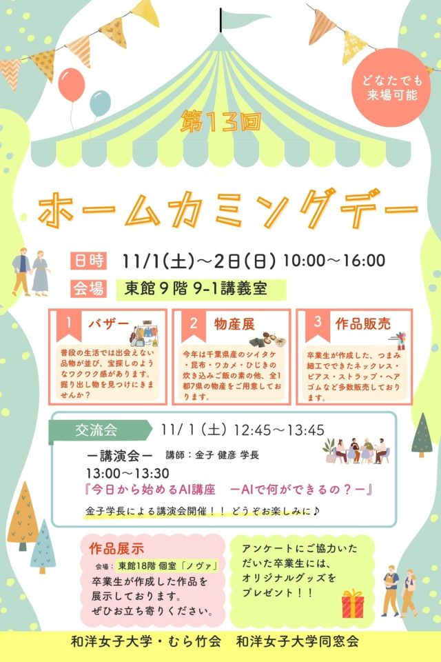 11月1日(土)・11月2日(日)の里見祭(大学祭)の期間中、「第13回ホームカミングデー」を開催します。恒例のバザーや物産展、卒業生が作成したつまみ細工の販売など、今年も人気のイベント目白押しです。歓談コーナーもありますので、懐かしい先生や同窓生たちとお話しながら、ゆっくりくつろいでいただけます。東館18階の個室「ノヴァ」では卒業生による作品も展示しますので、併せてご覧ください。また、アンケートにご協力いただいた卒業生にはオリジナルグッズをプレゼント。卒業生ではない方にも、和洋女子大学のSNSをフォローして下さった方にオリジナルグッズを差し上げます。