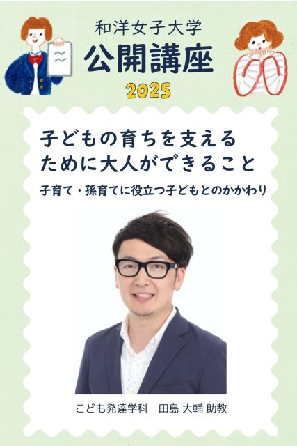 11月8日、産官学・地域・生涯教育センター※主催の公開講座「子どもの育ちを支えるために大人ができること 子育て・孫育てに役立つ子どもとのかかわり」を開催しました。講師は、こども発達学科の田島大輔助教です。