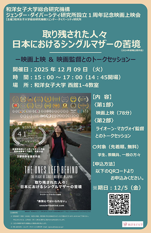この度、設立1周年記念事業として、和洋女子大学の構内にて映画上映会を開催します。上映作品は、世界各国の映画祭で数々の賞を受賞し、文部科学省選定作品にもなった『取り残された人々:日本におけるシングルマザーの苦境』(2024年劇場公開作品)です。作品の視聴を通して、現代の日本における「隠された貧困」と女性、特にシングルマザーが直面している苦悩について考える機会にしたいと思います。