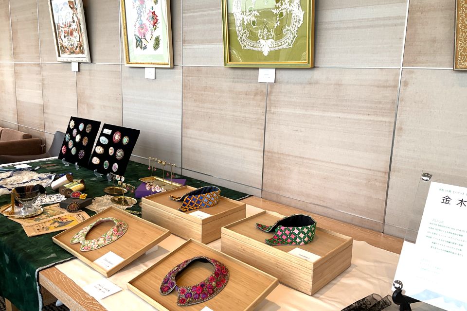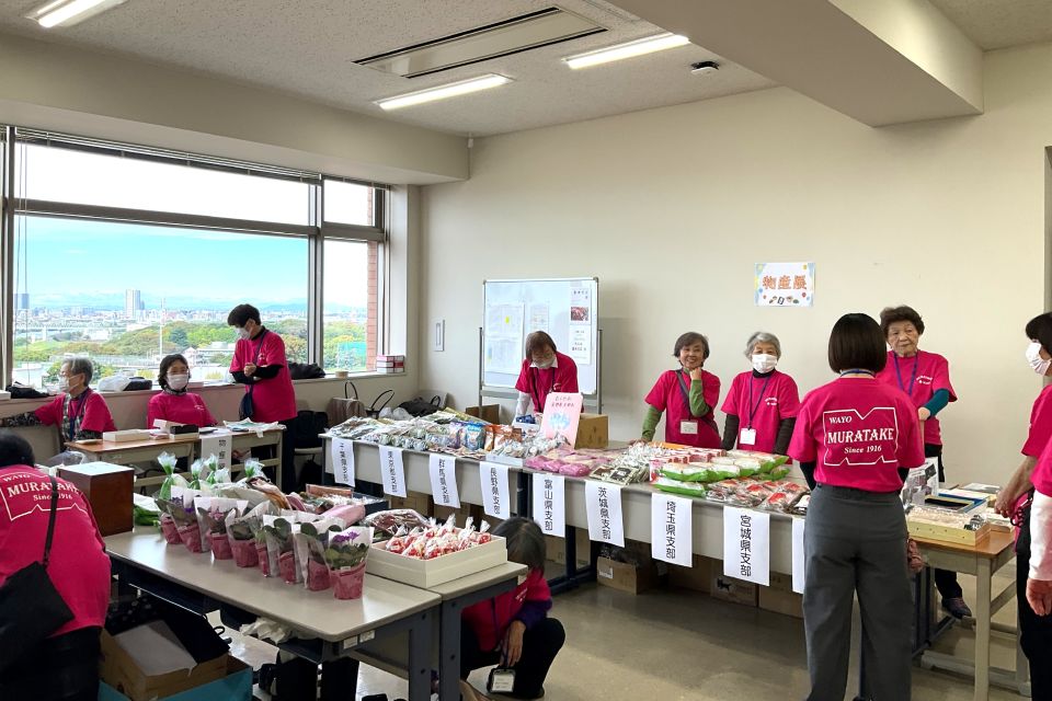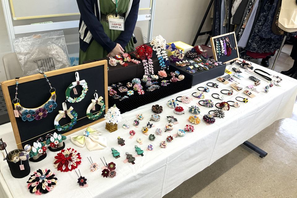 11月1日・2日の里見祭(大学祭)にて、むら竹会和洋女子大学同窓会主催の第13回ホームカミングデーを開催しました。今年も多くの卒業生の皆さまにご来場いただき、懐かしい方との再会や交流の場として、温かい雰囲気に包まれた2日間となりました。会場となった東館9階9-1講義室では、毎年好評をいただいているバザーや物産展に加え、卒業生による「つまみ細工」などの手作り作品を販売する「作品販売」コーナーを設置、可愛らしい作品が多数並び、来場者の目を楽しませていました。物産展では、各地の同窓会支部から届けられた名産品が並び、来場者の注目を集めました。ひじきご飯の素や肉厚なしいたけ、地元の銘菓など、地域の味を感じられる品々が揃い、懐かしさとともに、卒業生のつながりの広がりを感じることができました。18階ラウンジ「Wayo DINER」の個室ノヴァでは、卒業生の金木佳江さんによる「作品展示」を行いました。色合いが素敵で繊細なオートクチュール刺繍の作品が多数展示され、来場者は数々の作品に引き込まれていました。
