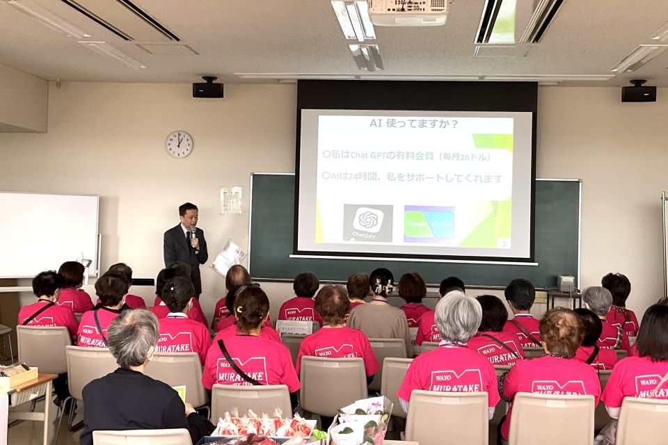 講演会では、金子健彦学長が「今日から始めるAI講座―AIで何ができるの?―」をテーマに、日常生活の中で感じる健康に関する困りごとを、AI技術を活用して解決していく方法について紹介されました。例えば、血圧の記録を忘れてしまうといった習慣化の難しさに対して、AIを活用することで記録の促しや管理が可能になること、また、食事の塩分量について相談したり、ストレスに感じていることをAIに話すことで心のケアにもつながることなど、身近な事例を交えながら、AIを上手に暮らしに活かす工夫が紹介されました。健康管理の新しい可能性に対する関心が高まる講演となりました。