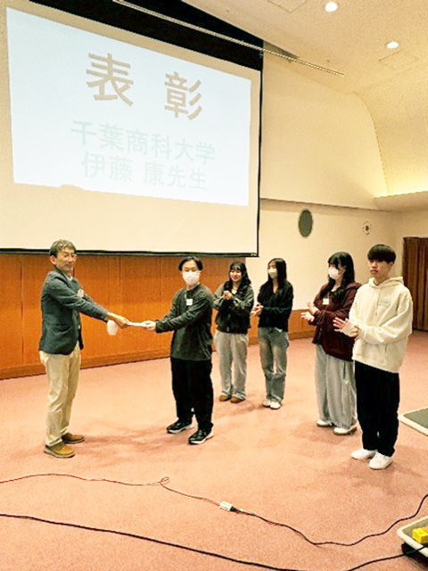 発表後には、全参加者による投票が行われ、3グループが表彰され、記念品が千葉商科大学の伊藤康教授から手渡されました。その後、会場を The University DINING に移して懇親会が開かれ、両大学の交流を深めながら、今後のインゼミ大会の継続や次年度に向けた意見交換が、和やかな雰囲気の中で進められました。