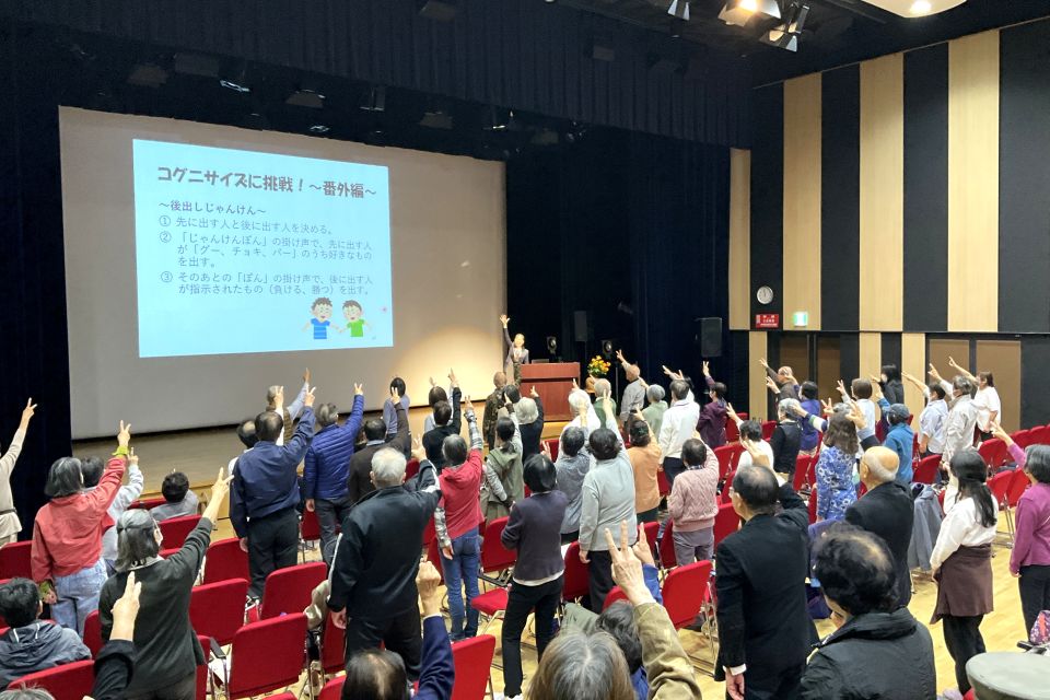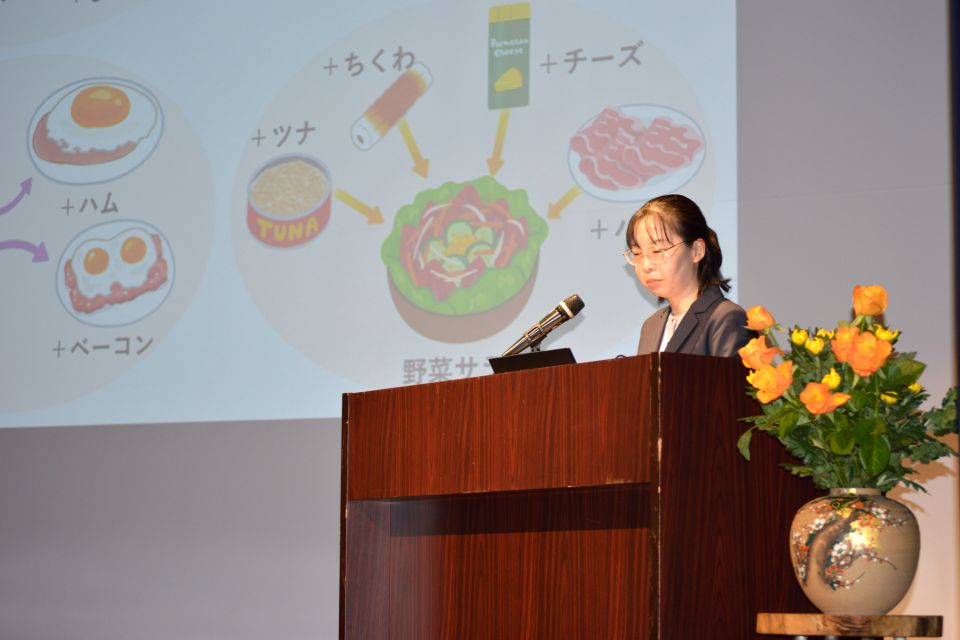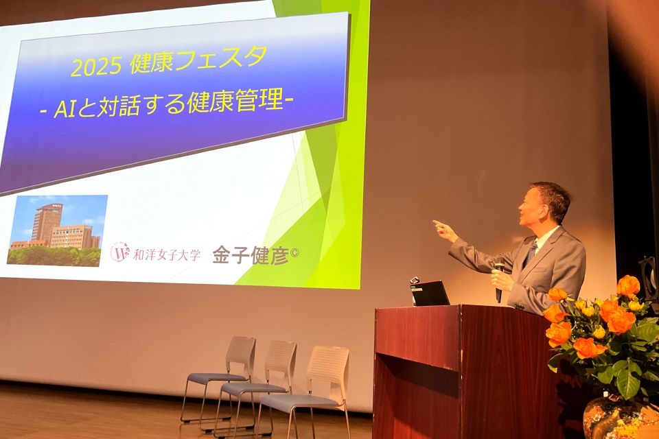 午前の部では、「健康都市推進講座」と題し、健康栄養学科の原光彦教授が「さ・わ・や・か・ダイエット」と題して登壇。子どもから高齢者まで幅広い世代が実践できる健康長寿のための食生活について、具体的な食材を挙げながら分かりやすく紹介しました。古来より伝承されてきた日本食の良さに触れながら、原教授の優しく楽しい語り口調で、会場は終始和やかな雰囲気に包まれました。続いて、同学科の内野礼子助教による「今日からはじめるフレイル予防!」の講演が行われました。フレイル(加齢に伴う心身の衰え)を予防するための生活習慣について、運動・栄養・社会参加の3つの側面から具体的な取り組みが紹介され、参加者は熱心に耳を傾けていました。講演の後半では、参加者全員が起立し、内野助教の指導のもと「フレイル体操」を実践しました。見た目には簡単そうに見える動きでも、実際にやってみると意外と難しく、会場には驚きと笑顔が広がりました。体を動かすことで、健康への意識が一層高まり、参加者同士の交流も生まれる、活気あるひとときとなりました。