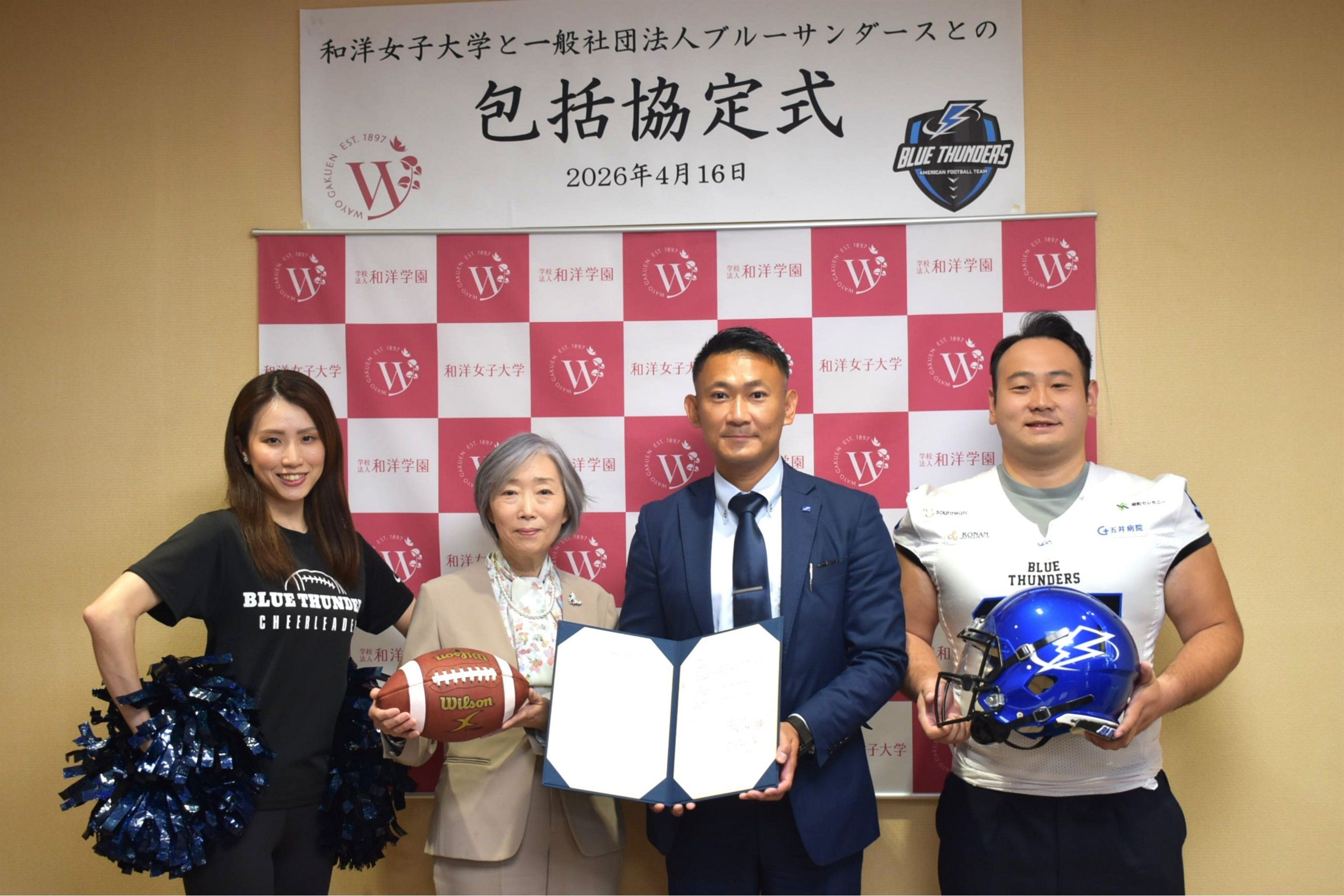 2026年4月16日、和洋女子大学は一般社団法人ブルーサンダースと包括連携協定を締結し、協定式を開催しました。この協定は、医療、健康、福祉、スポーツ等の分野で相互に協力し、スポーツと教育を通じた地域創生の推進及び人材の育成、地域社会の発展に寄与することを目的としており、双方の強みを活かした連携を推進していくものです。今後は、地域貢献活動や教育・研究分野における協働を通じて、学生の実践的な学びの機会を創出するとともに、地域社会へのさらなる貢献をめざしてまいります。